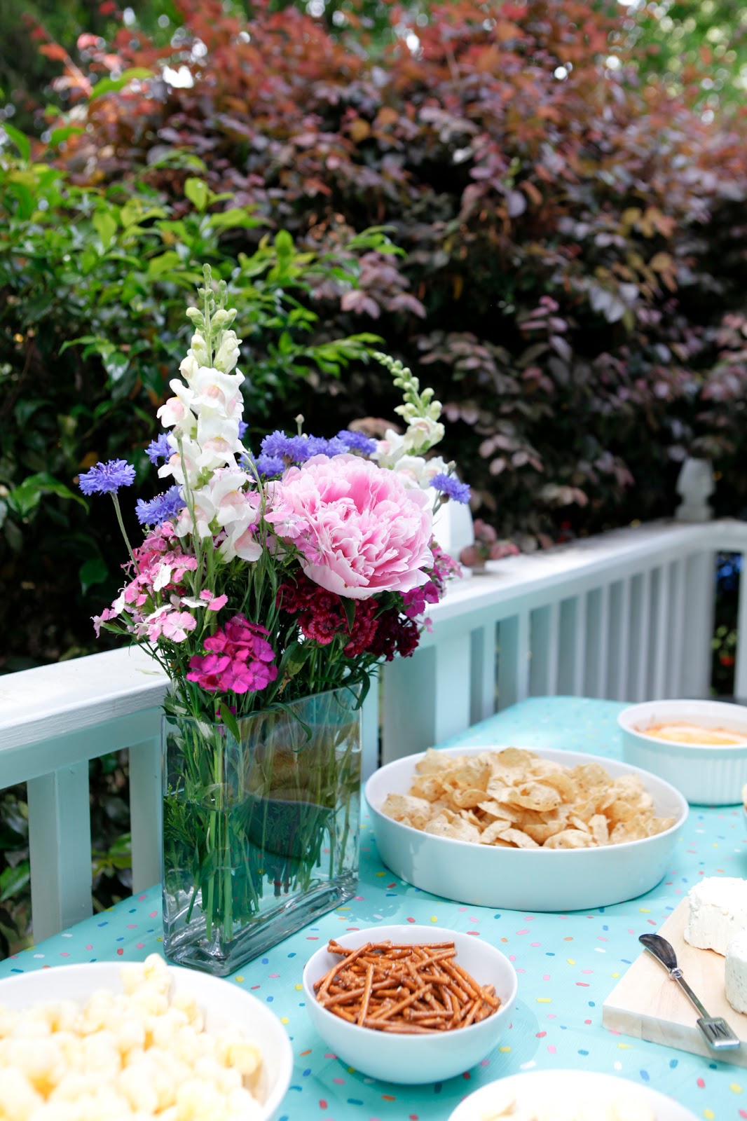 I picked up two bouquets of flowers from the farmers market for the table decor. Everything else we already had in my party bins that Matt thankfully agreed to dig through the garage to find!
