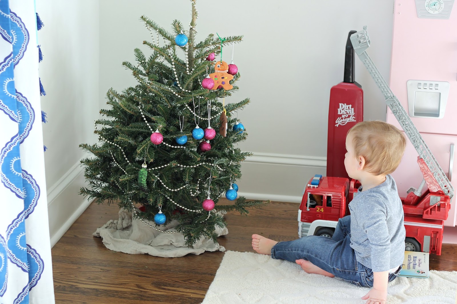 This year Matt, Thomas and I decided to get a live flocked tree! You know who was adamantly opposed to it? Caroline. After a strong “But I don’t want snow on my Christmas tree!” meltdown we compromised and let her pick out a mini tree without snow for the play room. Everyone was happy.