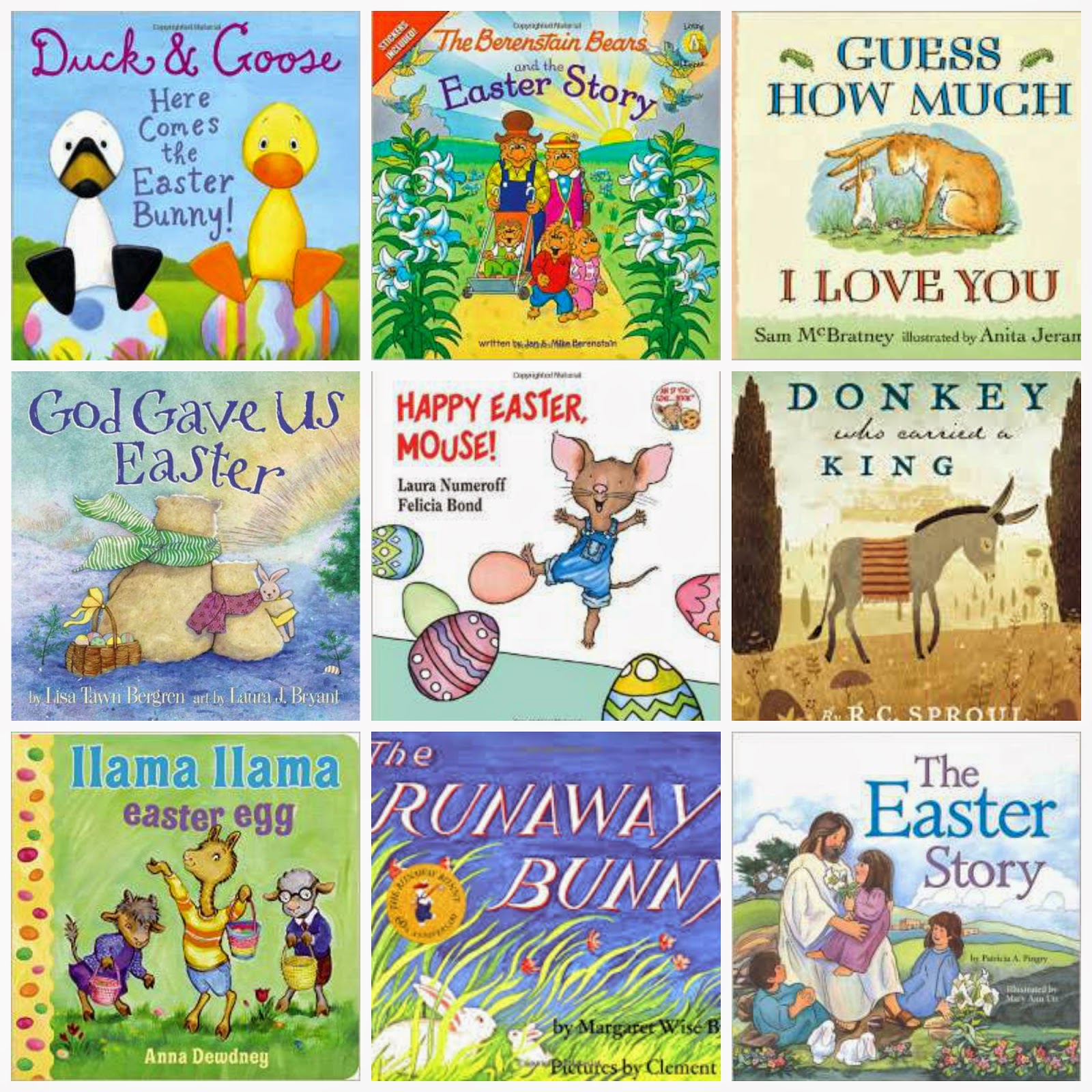 Duck & Goose, Here Comes the Easter Bunny // The Berenstain Bears and The Easter Story // Guess How Much I Love You // God Gave Us Easter // Happy Easter, Mouse // The Donkey Who Carried a King // Llama Llama Easter Egg // Runaway Bunny // The Easter Story