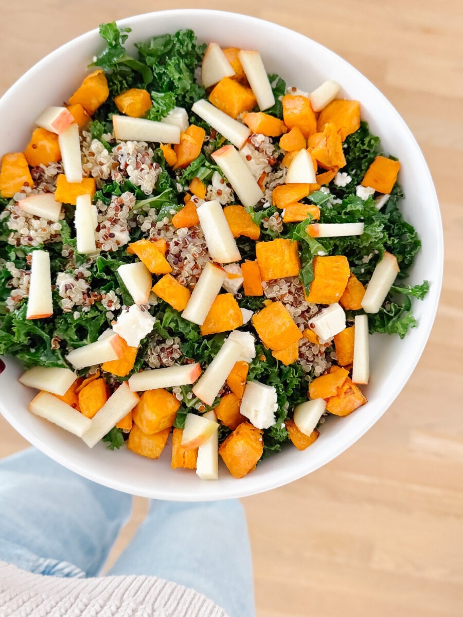 This salad was part of our dinner line-up this week and is peak fall in a bowl! It’s sweet, crunchy, and drizzled with the dreamiest apple cider vinaigrette!