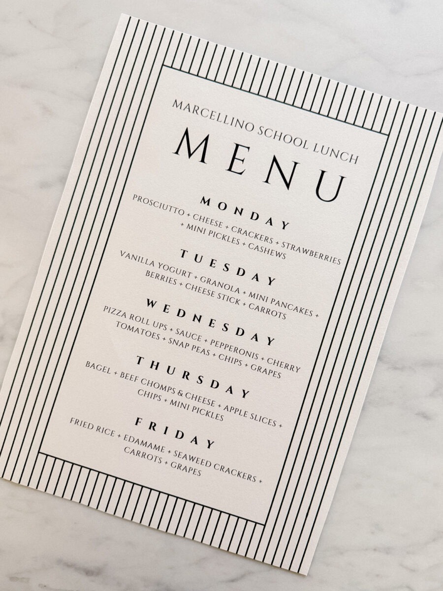 I like to keep a rotating “menu” (made in Canva) on the fridge that both kids agree on. It makes deciding what to pack each morning so much easier and also helps a ton with grocery shopping since I know exactly what to keep stocked. The system is very similar to my meal planning framework, just applied to school lunches.