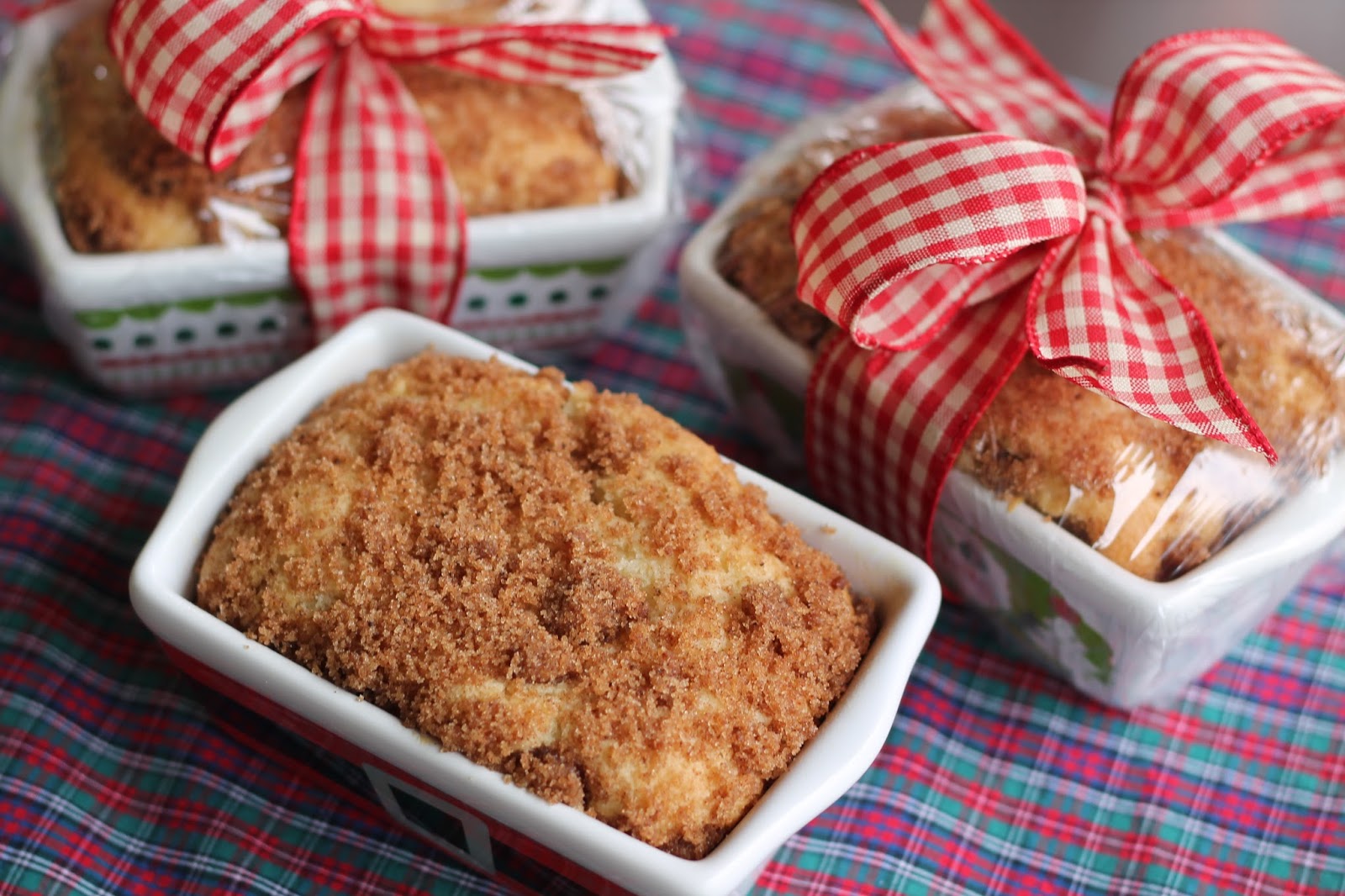 This is my annual go-to gift for teachers, friends, neighbors and more. First I head to Michaels (or Amazon) and stock up on holiday ceramic mini loaf pans. You can also use disposable tins too. Depending on how much time I have to prepare the loaves, I’ll either use this easy Cinnamon Bread recipe or Cinnamon Crumb Cake Mix (you can also find this at Walmart & Target). Each box of crumb cake makes 2-3 mini loafs. Once they are cool I plastic wrap them and tie a bow on top. Easy, delicious and I can make large batches quickly!