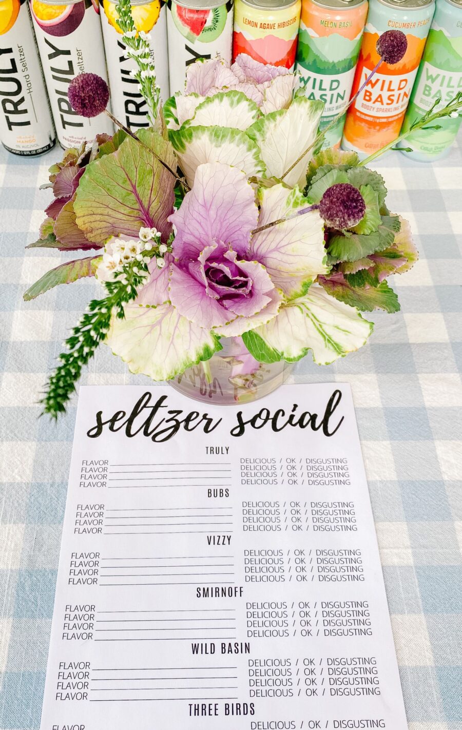 I hosted a seltzer tasting for our group one summer, and it ended up being such an easy, fun way to gather. Each girl brought a case of hard seltzer and an appetizer, and we set them all out for tasting.