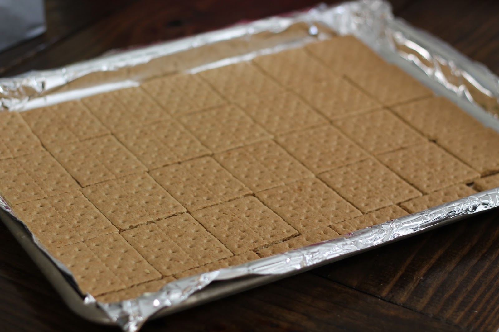 Line an 13 x 9" baking sheet with aluminum foil and mist it with baking spray. Tightly arrange graham crackers in a single layer. You may need to break a few into smaller pieces. Set aside.