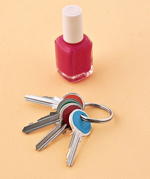 10. Nail Polish as Key Coder. Differentiate your keys by color-coding them with your favorite nail polish. Lay keys flat and apply a thick coat of a different shade to the top of each one. {this furthers my Essie obsession}