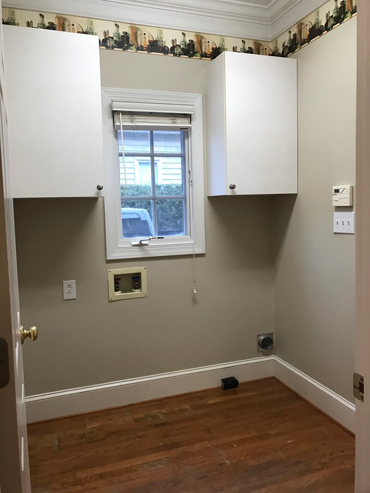 In other exciting news, I get to unstack our new washer & dryer set! #shortpeopleproblems Oh, and it was a hard decision, but we ultimately decided to part with the wine wallpaper border, although it looks like tractor wallpaper in photos (which would be even cooler). Y’all, there is SO much wallpaper in this house — SO MUCH.