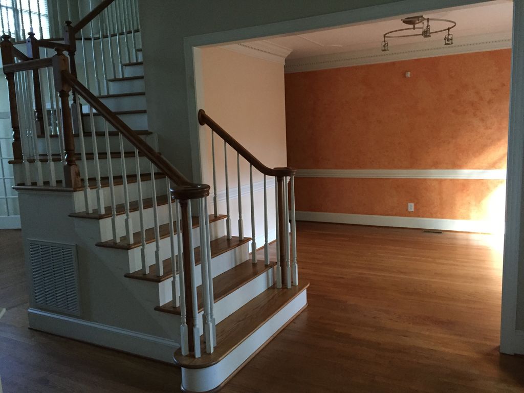 Entry Way & Dining Room: Replacing that fabulous light fixture is high on my wish list. Right after replacing the bright orange decoupage walls in the dining room…
