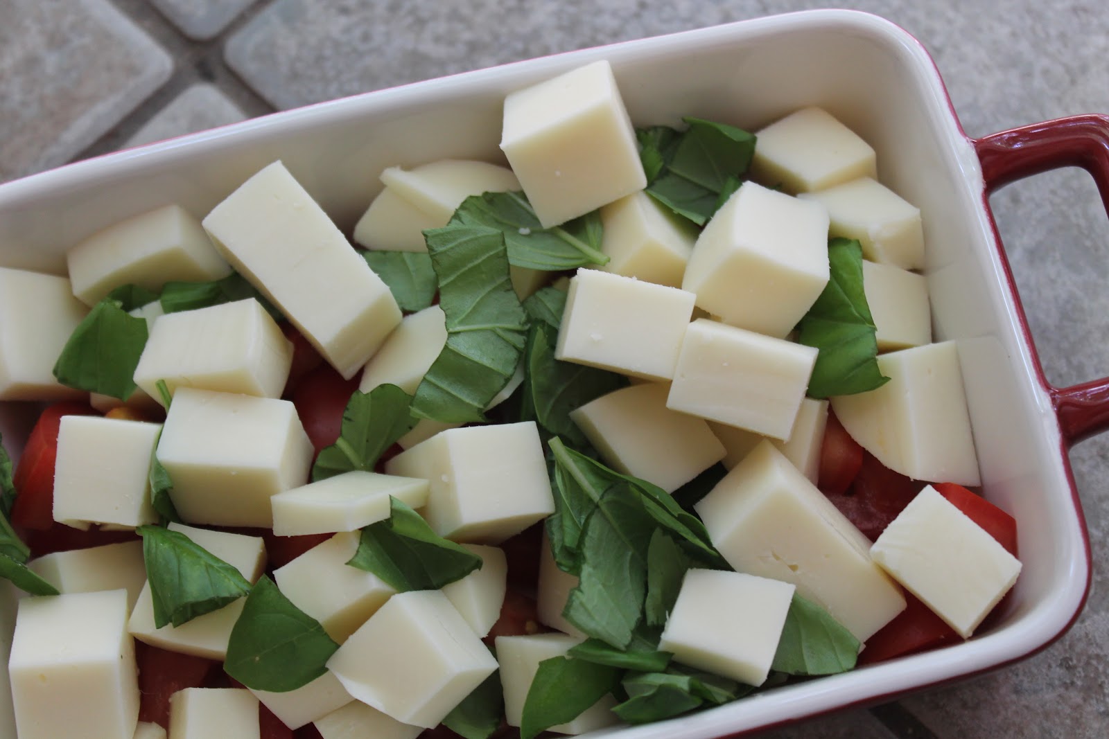 - Combine the ingredients: In a small baking dish, mix the chopped mozzarella, tomatoes, and basil together. Stir until everything is well combined.