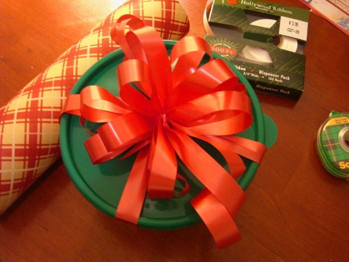 step 6: Place the bow on your present, and tie the loose ends [from ribbon 1] to stabilize the bow. Tight!