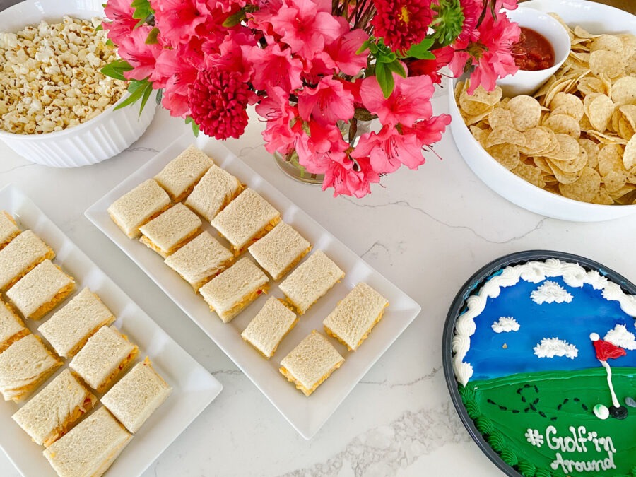 For this Masters Party, I kept it pretty chill with the food, mixing in a few appetizers with the traditional Masters favorites. You can’t go wrong with a spread of mini sandwiches—pimento cheese, egg salad, and chicken salad. To keep things easy (because who has time to make all the sandwiches from scratch?), I grabbed containers of each salad from the grocery store, then just assembled and sliced them into little squares. Quick, easy, and delicious!