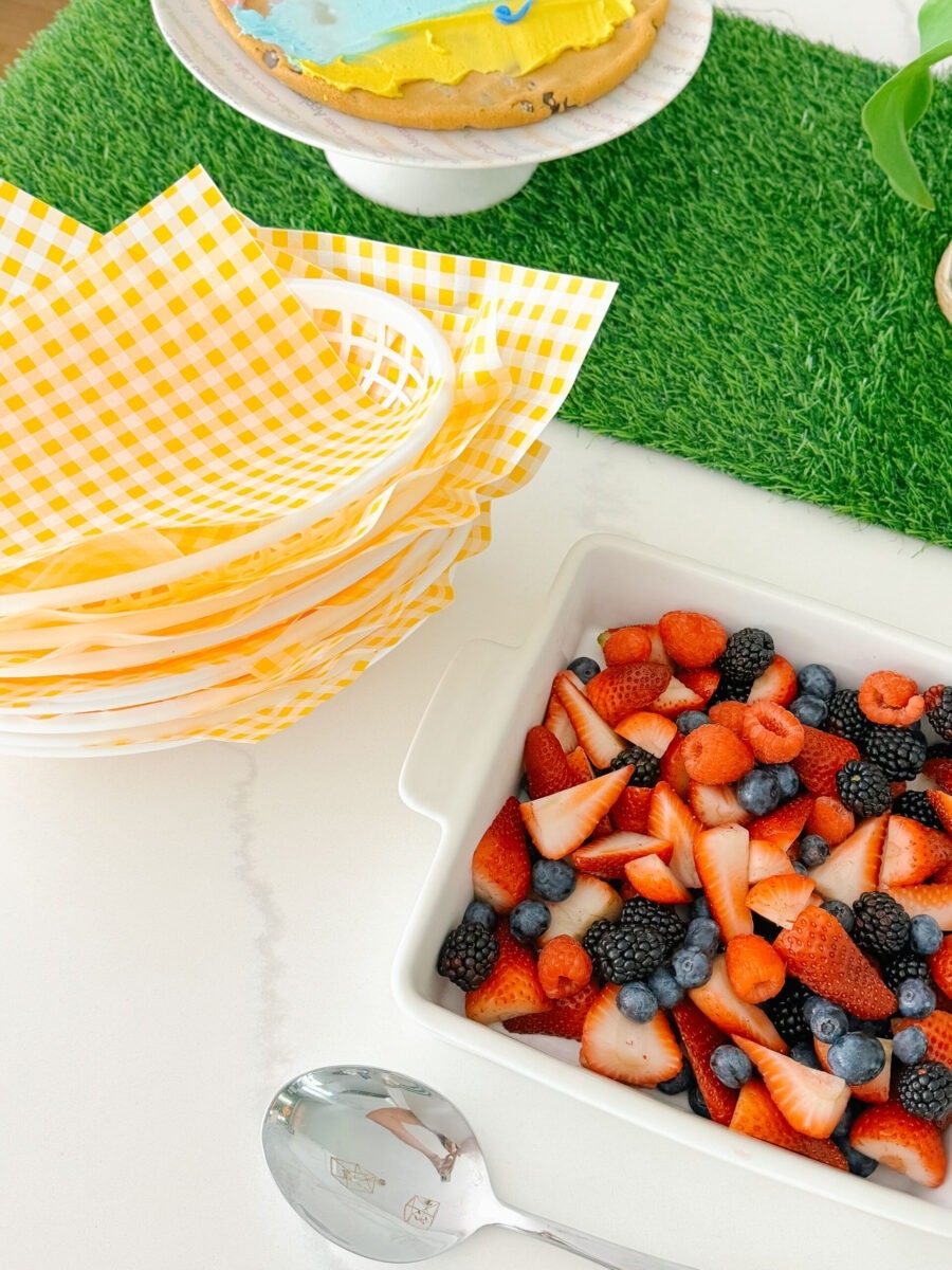 As for the kids, they had a blast in the pool, munching on hot dogs, potato chips, and fruit. They also thought the baskets with yellow checkered paper were super fun—a little nod to that classic Masters vibe!