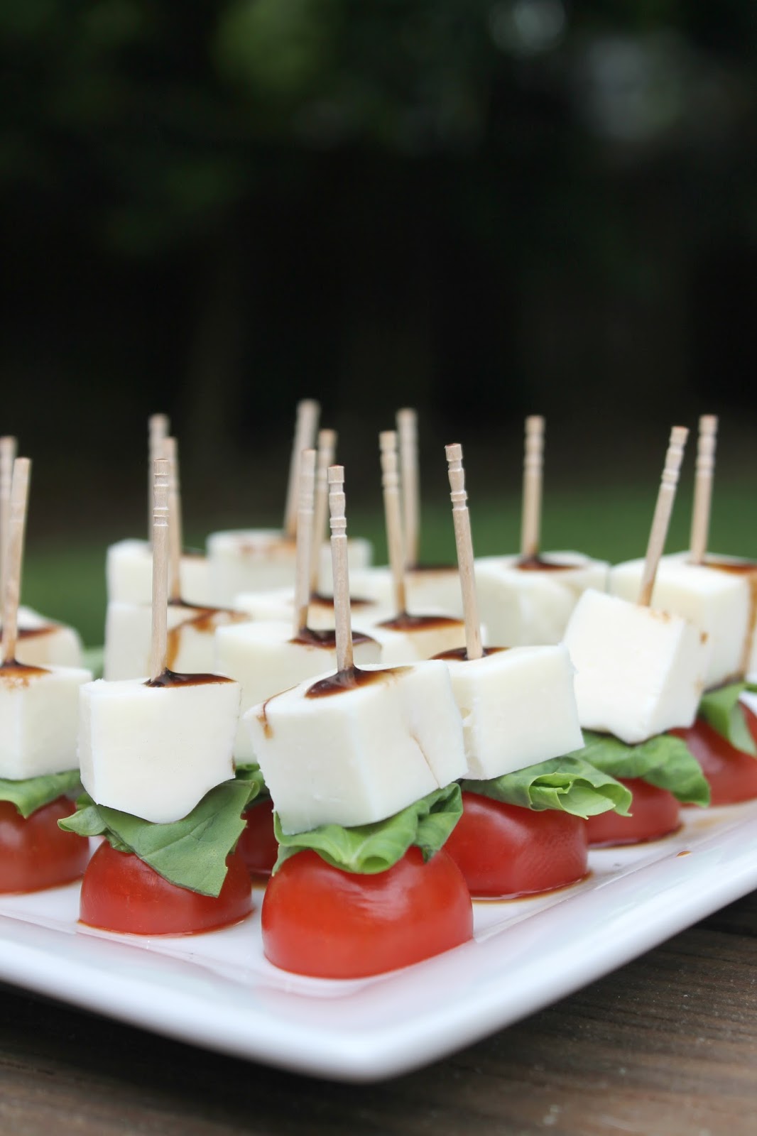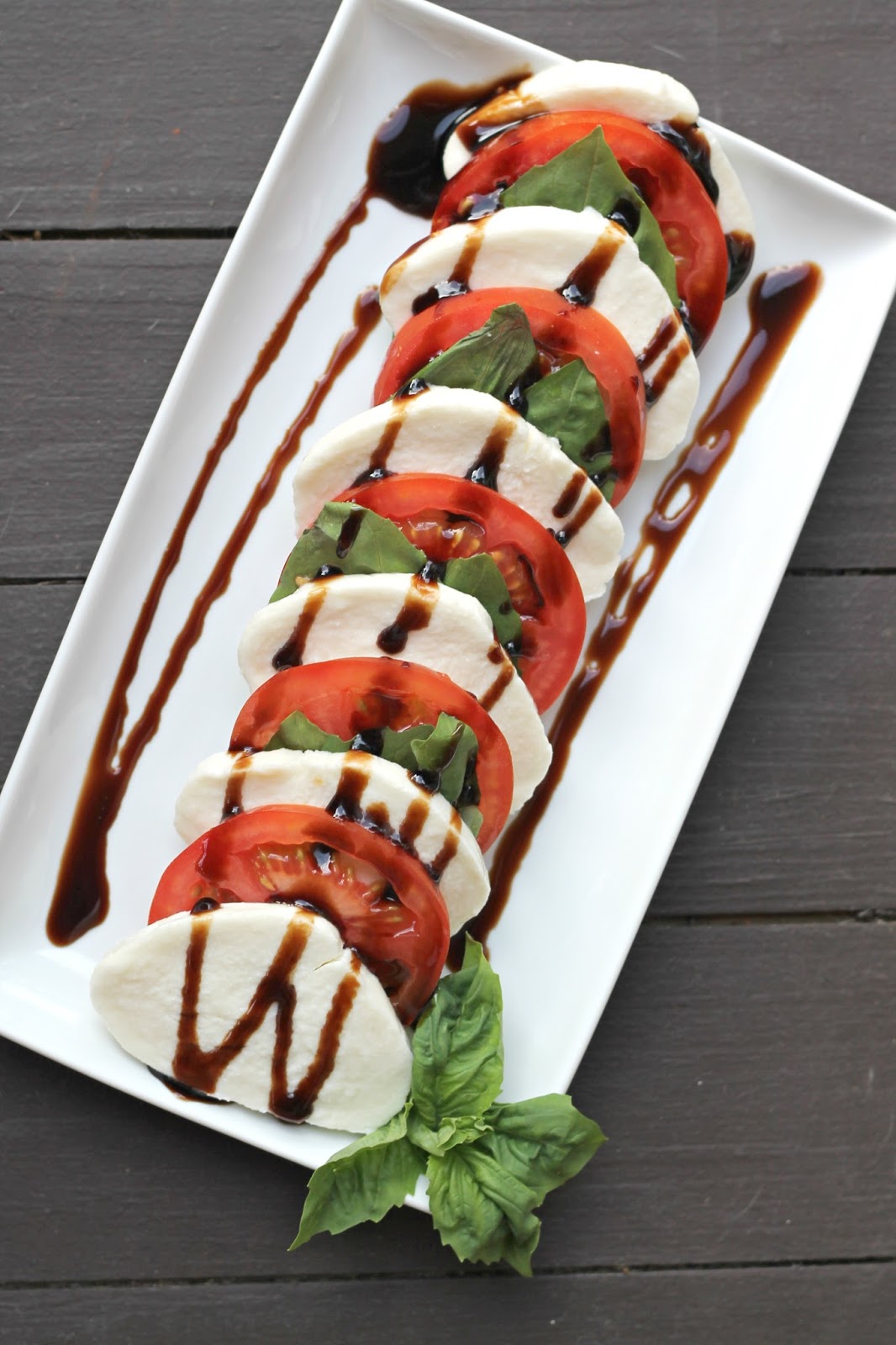 Caprese Salad: On a plate alternate sliced tomatoes, thick sliced mozzarella cheese and basil leaves. Drizzle with balsalmic glaze. Enjoy!