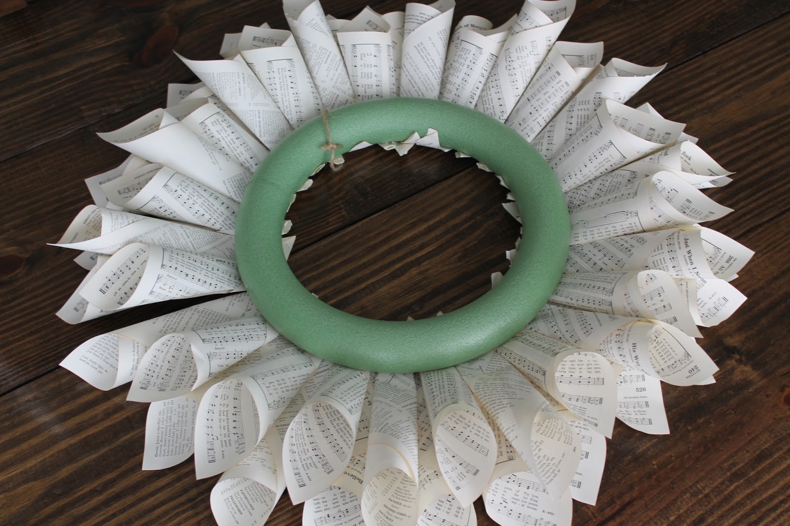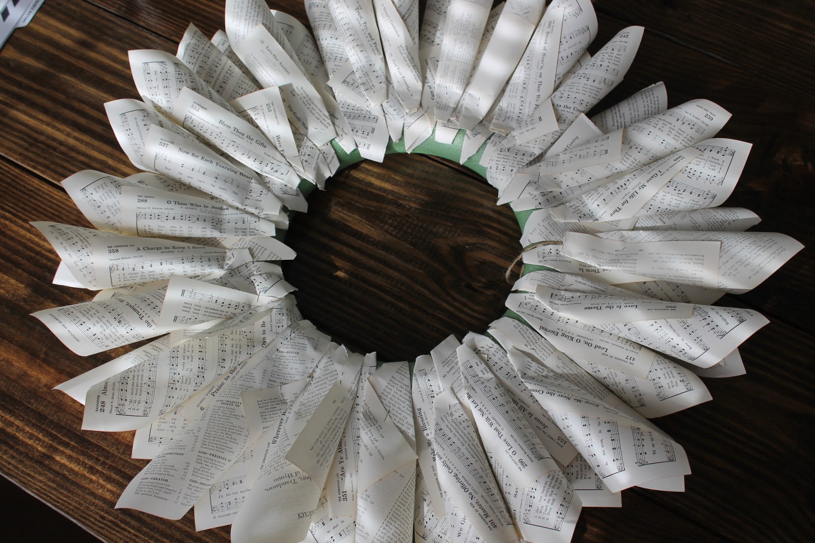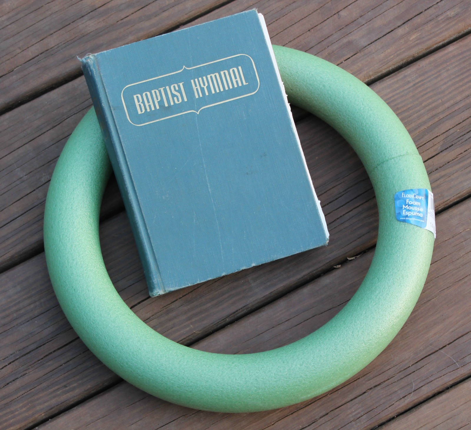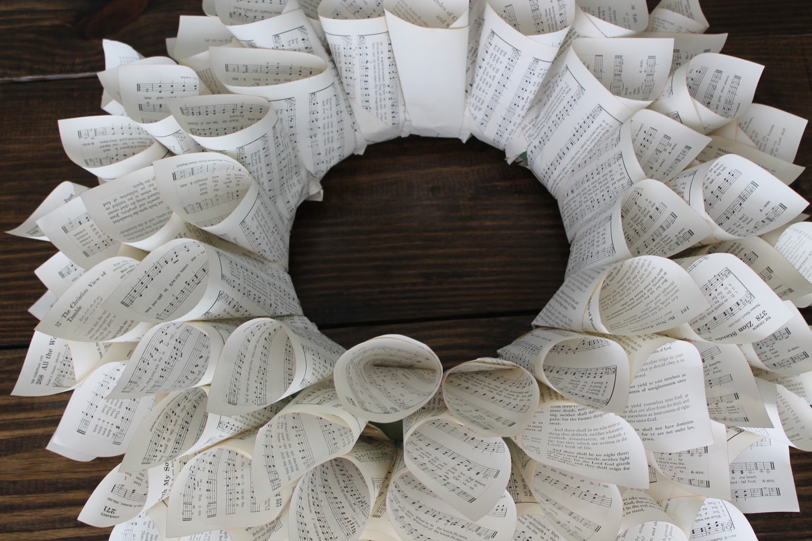 I wanted my wreath to be absolutely massive, so I went with a 16-inch Styrofoam wreath as my base. You could also use a straw or stick wreath if you prefer. To give it a more vintage feel, I decided to go with a 1952 Baptist Hymnal that I found at a local antique store. I wanted the wreath to look a bit aged rather than bright white, and this book was perfect for that! You’re going to need a ton of pages for this project, so I recommend grabbing a long book or even two—just to be safe. My hymnal had 500 pages, and I used almost the entire thing!