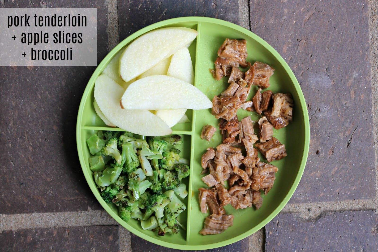 Pork tenderloin, apples and broccoli. Only Caroline will eat the broccoli but hey, at least I tried. I love this dinner because the pork is a two-ingredient crock pot recipe — super easy and the whole family loves it!