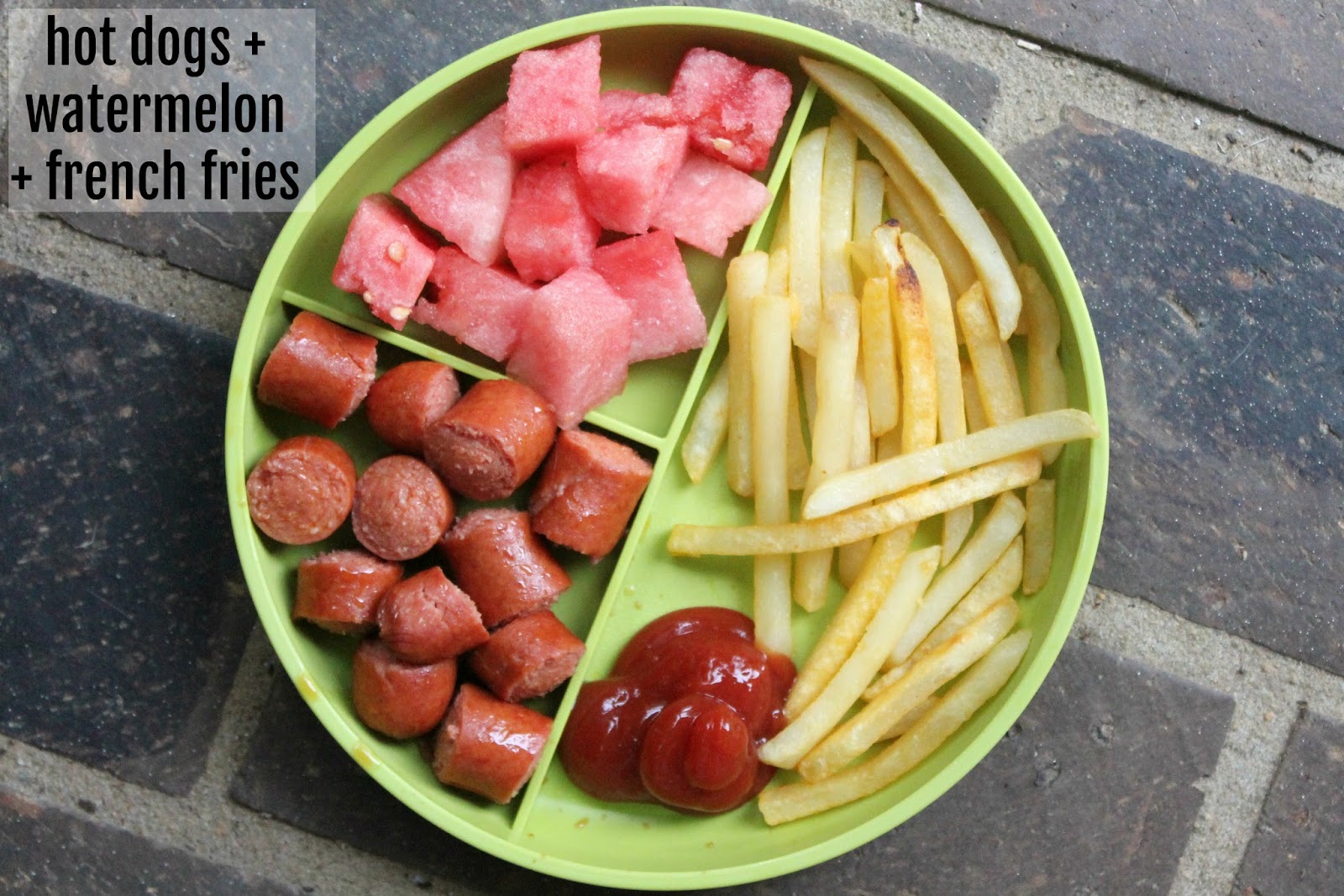 Hot dogs, french fries, watermelon and loads of ketchup.