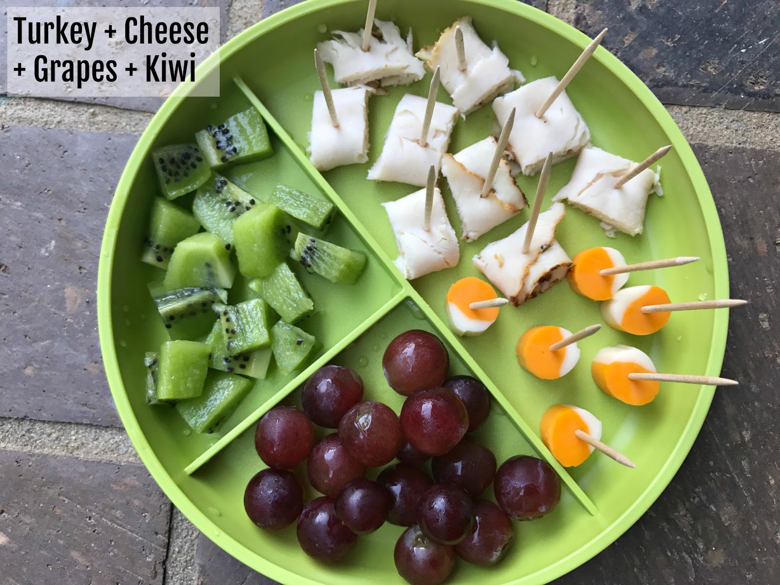 Kiwi, Grapes, deli meat rolled up, cubed string cheese. We like to call this the “grocery samples dinner.” If played infrequently, the samples dinner is usually a success. Note: this dinner does not work without the toothpicks – not even close. And yes, Thomas has to be closely monitored with the toothpicks.