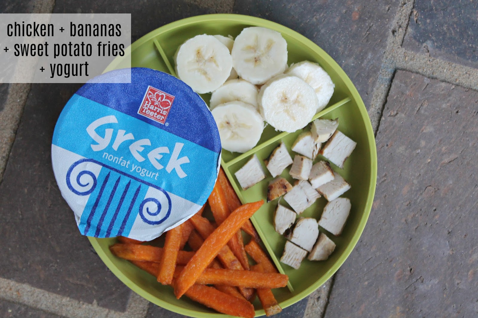 Grilled chicken, bananas, sweet potato fries and yogurt. One trick I picked up over the years of toddler meals is grabbing a pre-grilled chicken breast from the store on my way home from work. It’s SO easy, cheap and ready to eat.