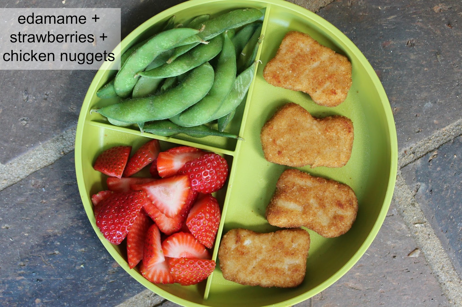 Chicken nuggets + edamame + strawberries.