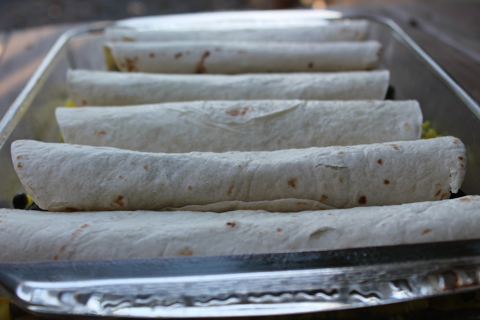 - Pour cooked rice evenly into your baking dish, spreading it into a thin layer. Scoop a ½ to ¾ cup of cooked vegetables into a flour tortilla. Roll tightly and place into dish. Repeat until you cannot fit any more tortillas in dish.